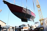 Das neu erworbene Boot wird nach Mainz Mombach gebracht. Den Transport mit dem Tieflader hat der alte Besitzer übernommen. Dann das Boot ins Wasser, den Rhein lassen war unsere Aufgabe.