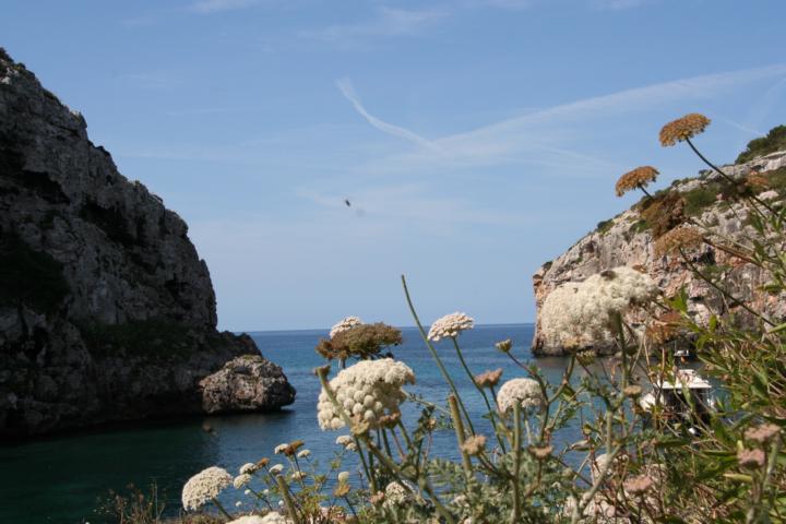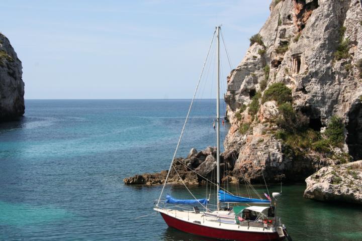 Inzwischen haben wir Mahon hinter uns gelassen und sind in Richtung Cala Covas gefahren. Nachdem wir den Leuchtturm passiert haben konnten wir zumindest mal wieder das Groß setzen. Der Wind kam, na aus welcher Richtung, natürlich aus Süd dann drehte er auf Süd-West also gegen uns. Nun ja so sind wir die steile Felsküste entlang motort bis wir die Felsspalten, den Eingang Cala Covas sehen konnten. Es ist immer wieder erstaunlich, man muss praktisch davor sein, um zu sehen, daß sich dort eine Bucht auftut. Es war nur ein Segler drin, der etwas später am Nachmittag wieder weiterfuhr. Unser Ankermanöver klappte recht gut. Ich hatte versucht die erste Leine schwimmend an Land zu bringen, aber die Dünung machte mir ein wenig zu schaffen, sodass ich mich mit den Füßen am Fels halten musste und merkte recht bald, dass es da Seeigel gibt!! Ja so etwas, während all meiner 25 Jahre in Venezuela habe ich keine Erfahrung mit diesen Seeigeln gemacht, trotz Tauchen, Schnorcheln und Schwimmen zwischen Felsen. Nun ja, einmal muss das erste mal sein und das war hier in der Cala Covas. Wir wollten in die westliche Ecke dieser Bucht hinter einen Felsvorsprung und das bedeutete etwas Arbeit mit den Landleinen und setzen eines zweiten Anker. Wunderschön war auch das klare Wasser. Wir konnten bis in 5m tiefe schauen oder sogar mehr! Da machte das schwimmen auch Spaß! Endlich hatten wir unseren Ankerplatz so wir es vorhatten und konnten dann mal an das Abendessen denken. Dieses fiel dann recht ergiebig und ausgiebig aus mit dem guten Rotwein dabei! Lange konnten wir draußen in der Plicht sitzen bis es uns zu kalt geworden ist.