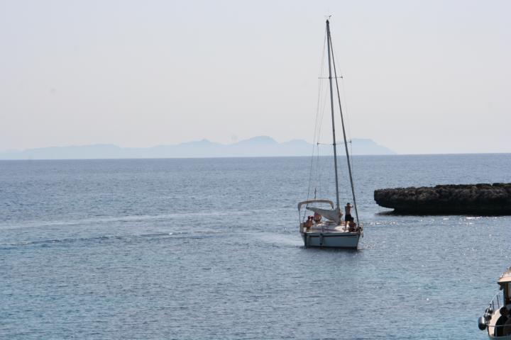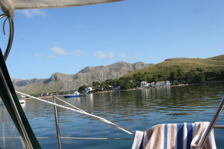 Vor dem Frühstück ging es erst einmal ins Wasser und mindestens einmal ums Boot geschwommen. Erst danach das Frühstück und dann wollten wir mal ans Land um zu sehen wo der Supermercado, in der Karte eingetragen, ist. Nachdem das Dingi bereit war ging es auch schon gleich los.. Zwischendurch sah man auch Felsen und Seegras. Am Ende der Bucht ein Hotelkomplex und ein kleiner Sandstrand. Dort tummelten sich viele Leute und die Kinder spielten in dem herrlichen Wasser. Wir marschierten bergauf um den Supermercado zu suchen. War nicht einfach, da man auch keine Leute traf um zu fragen. Schließlich fanden wir Hinweisschilder und folgten diesen. Uff, war ganz schön heiß in der Mittagssonne. Im Supermarkt angekommen, suchten wir das was wir brauchten und schon ging es zurück. Zurück fanden wir einen kürzeren Weg wieder zu unserem Dingi. Wieder an Bord alles verstaut und dann kam das erfrischende Bad. Am Nachmittag noch einmal los um zu fotografieren. Wir konnten in der Ferne Mallorca erkennen, einmal die große Bucht von Alcudia und auch die Bucht von Pollenca. Wir fanden, dass auch dieser Ort mal mehr Menschen gesehen hatte. Viele leere Häuser deuteten darauf hin und viele standen auch wieder zum Verkauf! Ja, ja die Wirtschaft hat mal bessere Zeiten gesehen.