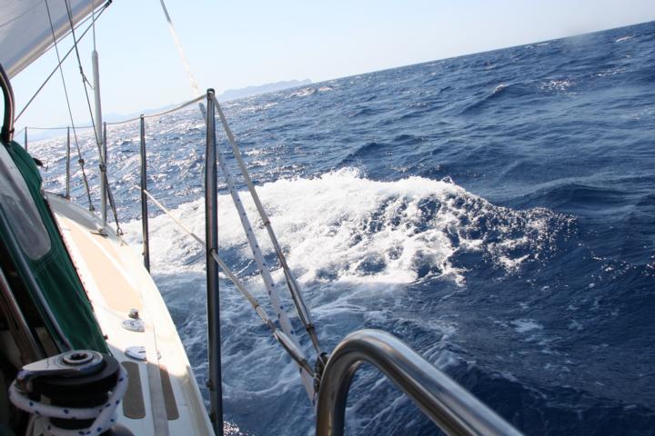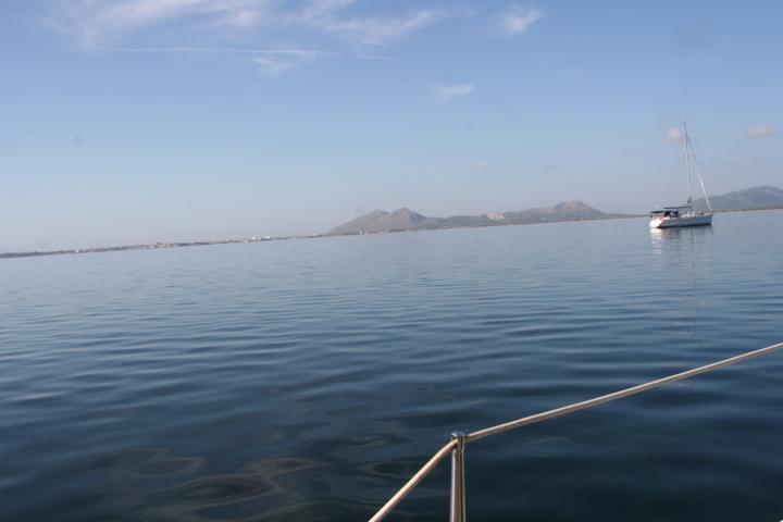 Heute überlegten wir erst wieder in die nahe Bahía zurückzufahren, entschieden uns aber nach Mallorca zu fahren. Ziel war Cala Ratjada, wenn der Wind passt was so aussah, da aus S kam. So setzten wir nicht lange nach der Ausfahrt die Fock und das Groß mit einem Reff und endlich mal den Motor aus. Dieses sollte auch den ganzen Tag so bleiben. Der Wind wechselte oft die Richtung, flaute ab kam wieder in Böen, aber glücklicherweise wechselte er zwischen S und SE. Um die Mittagszeit wurde er so schwach, dass wir schon die Segel wieder einholen wollten, als er plötzlich wieder anging zu blasen. Schnell wurden es 20kn und so kamen wir mit einer Geschwindigkeit bis zu 6kn über Grund voran, vor allem alles unter Segel. War das herrlich endlich richtiges Segeln. Da bei dem Wind Kurs Richtung Ratjada nicht möglich war entschlossen wir uns nach halber Strecke den Kurs so zu ändern um weiter segeln zu können Richtung Bucht von Pollenca. Am Kap del Pina schlief der Wind dann ganz ein. Wir holten Fock und Groß ein. Ließen den Motor beim Segelwechsel mitlaufen. Wieder plötzlich kam raumer Wind, sodass wir die Genua ausrollen konnten. So ließen wir uns langsam schaukeln. Das letzte Stück zum Ankerplatz mussten wir den Motor anstellen. Fast am gleichen Platz wie das erste mal, konnten wir den Anker in 3m Wassertiefe fallen lassen. Alles schnell aufgeklart und dann gab es das kalte Anlegerbier. Hmm und das schmeckte doppelt gut nach dem ersten vollen Segeltag! Wir waren glücklich und zufrieden. Wir staunen immer wieder wie schnell der Wind hier im Mittelmeer wechselt und sich sehr schnell Wellen und Dünung einstellen.