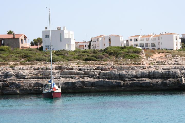 Heute wollten wir Strecke machen. Schon um 7Uhr standen wir auf und frühstückten - vorher natürlich unsere Runden um das Boot geschwommen - um 08h30 war der Anker oben und es ging los. Als Ziel hatten wir endlich Menorca/Ciudadella angestrebt mit der Option weiter in die Cala Fornells. Es lief gut, wir hatten die Fock und das Groß gesetzt, ließen aber den Motor mitlaufen, da wir schon schnell sahen, dass wir unser Tagesziel Cala Fornell erreichen können. Die Nord-Küste Menorcas ist sehr kahl, fast ohne Bewuchs. Zumindest von der Seeseite aus gesehen. Immer mal wieder sahen wir an exponierten Punkten Wohnungsanhäufungen, einfach schrecklich!