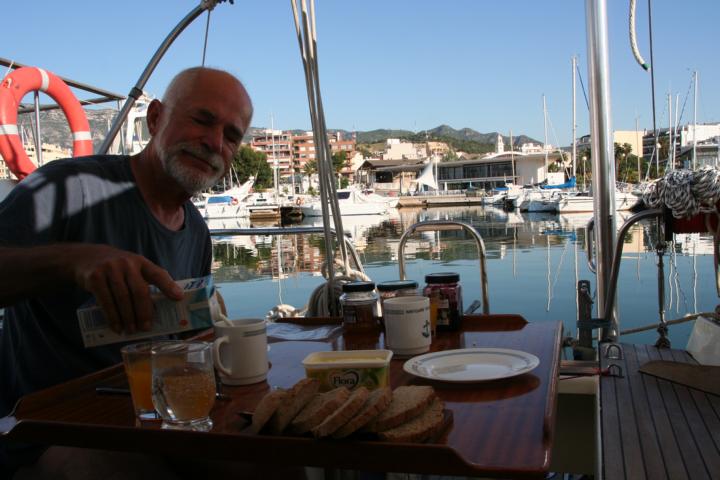 Heute morgen lachte die Sonne wieder voll in die Koje. Es war inzwischen 8Uhr30, wir standen auf. Tapfer sind wir erst ins Wasser um unsere 2 Runden um das Boot zu schwimmen. Es war windstill und das Wasser doch angenehm wenn man sich bewegte. Anschließend schmeckte der Kaffee nochmal so gut. Heute Vormittag wollten wir eigentlich in die Marina fahren. Schoben es erneut auf, da es so ein schöner Tag war und Ludwig einiges in Ordnung bringen wollte.