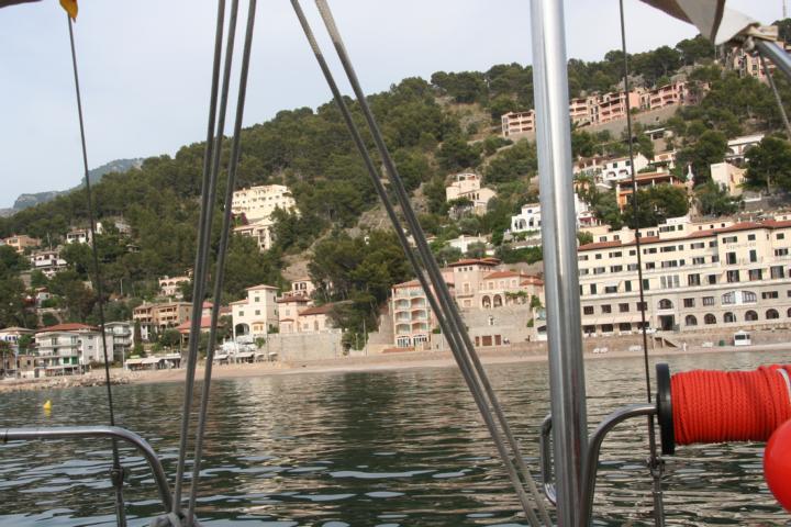 Inzwischen ist es ein Tag später, also der 27.5. geworden. Gestern bevor wir los fuhren, stellte Ludwig noch die Ventile unseres 33PS Antriebmotos ein. Wir hatten im Ort nach einem Mechaniker gefragt, aber ohne Erfolg. Letztendlich war es gut so, denn mein Skipper meinte er würde es mal selbst versuchen. Er hatte es früher ja auch bei seinen Autos eingestellt und außerdem es gibt fast nichts was er nicht kann. Ich staune immer wieder. Nach nicht langer Zeit, es waren vielleicht eine halbe Stunde vergangen, meinte er, wir können losfahren! Also trafen wir alle Vorbereitungen um abzulegen. Um 12:15 ging es dann los. der Himmel war nur leicht bewölkt, der DWD Wetterdienst sagt nichts dramatisches aus. Im Löwengolf sollte ein Mistral durchgehen, aber keine Probleme auf unseren Weg weiter südlich machen, na ja!! Nicht lange und wir konnten das Großsegel und die Genua setzen und den Motor aus. Endlich und diese Ruhe kein Motorengeräusch mehr. Der Wind drehte vorlicher und es ging nicht mehr mit der Genua, so setzte Ludwig die Fock. Gute 2 Stunden konnten wir weiter segeln, wie wir das genossen. Doch bald wurde der Wind immer weniger, sodass wir den Motor wieder starten mussten. Es war eine so ruhige See, dass wir an unsere Bekannten dachten, welche immer wieder Karten spielten. also holten wir die Karten und spielten 2 Runden. Wir beobachteten das Barometer welches langsam aber stetig fiel! Bei 1020,5 liefen wir aus und um 18:00 waren es 1018,5, nichts schlimmes aber im Auge behalten. Mit der Ankerwache teilten wir es so ein, dass Ludwig bis um Mitternacht wachte und ich die "Hundewache" übernahm. Im Salon bereiteten wir das Schlaflager vor, d.h. den Salontisch absenken, die Polster drauf und fertig war das Bett. Ich versuchte zu schlafen, wurde aber nichts warum keine Ahnung. Aber schon das ruhen tat gut. Als ich mich um Mitternacht fertig machte und ich alle nötigen Informationen hatte, konnte Ludwig sich hinlegen. Es war reger Schiffsverkehr, hauptsächlich Tanker auf dem Weg nach und von Barcelona, sodass man aufmerksam auf dem Plotter (AIS) und natürlich der unerläßliche Rundumblick nötig waren. Es gab einen schönen Sternenhimmel welchen ich beobachtete und dann und wann sah ich auch Plankton aufleuchten. Es sah wunderschön aus. Ansonsten verlief alles ruhig. Ich ließ Ludwig über meine Wache hinaus schlafen, da ja nichts weiter los war. Der Wind frischte einmal etwas mehr auf aber die See blieb recht ruhig. Gegen 5h legte ich mich wieder hin und konnte doch so 1-1/2 Std. schlafen. Irgendwann sagte ich, ach wäre es schön jetzt einen Kaffee zu trinken. Nicht lange und Ludwig hatte mit dem kleinen Wasserkocher Wasser heiß gemacht und schon hatten wir den Morgen-Kaffee. Inzwischen gab es mehr Wellenbewegung aus Süden kommend. Ja mit Segelwind wieder nichts. Dafür sahen wir eine große Gruppe von Schweinswalen. Ludwig hatte sich wieder hingelegt. Ahnte er, das noch eine Herausforderung kam? Auf dem Wasser sah ich erst in der Ferne, dass sich das Wasser gräuselte. Ich beobachtete es weiter wie es langsam näher kam. Dann wurde der Wind allmählich stärker. Ich schaute auf den Windmesser, es waren schon 14-17Kn. Bei 20Kn sagte ich dem Skipper mal Bescheid. Und tatsächlich es wurde immer stärker. Die Wellen wurden höher mit Schaumkämmen. Dann kam eine Welle über den Bug welche uns schön nass spritzte. Ich holte die Jacken vom Naßzeug. Diese brauchten wir jetzt. Es wurde letztendlich eine recht anstrenge Fahrerei und immer gegenan. Zu unserem ursprünglichen Ziel, die Bucht von Pollenca, hätte bedeutet 8 Stunden bis in die Nacht gegenan. So änderten wir als Ziel nach Soller in 10 Meilen bei halben Wind, dort kann man auch vor Anker liegen. Soller kannten wir von einer Autotour schon. Eine schöne geschützte Ankerbucht, nur nicht wenn der Wind direkt aus Norden kommt. Die letzten Meilen zogen sich unendlich dahin. Ludwig gab dem Motor noch mehr Rpm. Es war wirklich eine ruppige Fahrt. Nicht lange vor der Einfahrt verschluckte sich der Motor plötzlich. Ludwig schaltete zum anderen Tank um, aber auch da das gleiche. Was war das. So verringerte er die Drehzahl und es ging gut. Endlich waren wir in der Einfahrt der Bucht. Wir schauten uns nach einem geeigneten Ankerplatz um. Dann das Ankermanöver. Erst rutschte der Anker und Ludwig legte noch einen Zweitanker. Nachdem der lag wollte er den Hauptanker wieder einholen und plötzlich war er fest. Endlich auch das geschafft. Erst einmal wurde der ganze Durcheinander wieder in Ordnung gebracht, die Nassen Sachen nach draußen zum trocknen. Dann sagte ich, jetzt erst einmal ein Bad. Normalerweise gehen wir in Hafen/Maria Bereich nicht ins Wasser. Da bisher wenige Yachten vor Anker lagen und vor uns der Badestrand war, zögerte ich nicht lange. Erst einmal holte ich das Thermometer raus, welches dann knappe 22° anzeigte, aber dann nichts wie rein nicht gerade warm aber erfrischend. Einmal ums Boot und abgebraust. Wir fühlten uns wie neu. Wie gut das tat. Anschießend machte ich ein paar Häppchen, denn den ganzen Vormittag hatten wir nichts gegessen, außer ein paar Keksen - uns war dann auch nicht mehr danach - damit das Anleger Bier nicht ganz in den leeren Magen kam. Ja der Erfolg des Bieres machte sich natürlich bemerkbar. Ich räumte alles weg und Ludwig streckte sich draußen auf der Bank aus. Ein kurzer Kampf mit mir selber, auch hinlegen oder gleich weitermachen. Ich entschied mich für letzteres. So machte ich die notwendigen Eintragungen ins Logbuch und auch noch ins Tagebuch. Anschließend fing ich gleich mit dem Abendessen kochen an. Ich bereitete alles vor, bevor ich den Generator zum kochen einschaltete. Herrlich war es, daß wir uns endlich draußen hinsetzten konnten. Bei einem Gläschen - oder ware es 2 ? - Rotwein schmeckte es herrlich. Wir genoßen noch den herrlichen Abend und den Sonnenuntergang. Dann schnell den Abwasch und den letzten Schluck Wein trinken. Kurz nach 9Uhr waren wir in der Koje. D