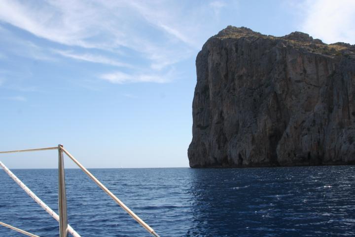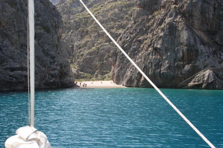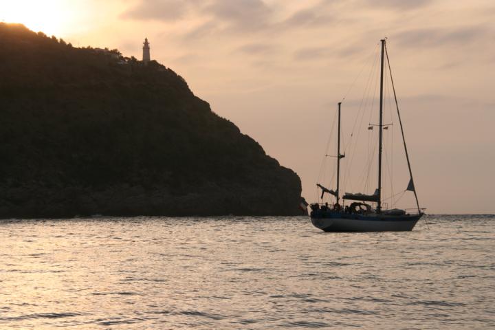 Heute war wieder ein herrlich Tag, aber kein Wind. So motorten wir bis zu einer Bucht welche Ludwig gerade auf der Seekarte sah. Die Küste ist beeindruckend mit hohen Felsen und an einer solchen hohen Felsnase sind wir in Richtung Bucht. Von draußen konnte man gar nicht vermuten, was sich da versteckte. Es war ein Bild welches ich mir auch in Skandinavien in einem Fjord vorstellen könnte. Man konnte dann doch einige Häuser rechte Hand versteckt erkennen und oberhalb sahen wir Menschen spazieren. Die Straße führte durch einen Tunnel zu einem Strand zwar klein und mit groben Kies, aber er war da. Das Wasser herrliches helles Blau da es Sandboden war. Eine schöne ruhige Bucht kommt natürlich darauf an aus welcher Richtung der Wind kommt wie fast überall. Dann ging es weiter. So ging es ein Kap nach dem anderem in Richtung Pollenca. Bevor es am letzten Kap dann in die Bahía de Pollenca ging, konnten wir den Leuchtturm und die Straße sehen, welche wir mal gefahren sind. Ja wer hätte gedacht, dass wir mit unserem eigenen Segelboot da mal entlang fahren werden. Ludwig hatte schon alle Leinen zurecht gelegt um endlich mal wieder ein Segel zu hissen. Nicht lange und die Genua kam raus. Schnell den Motor aus und uns ruhig von der Genua in Richtung Ankerplatz ziehen lassen. Es waren recht viele Boote unterwegs, klar es war Sonntag. So suchten wir uns einen schönen aus, wissend das es bald ruhiger wurde. Wir machten 2 Ankerversuche. Beim 1. mal sah Ludwig am Anker selber, das es ein sehr lockerer Sandboden mit Seegras war. Der 2. Ankerversuch war dann perfekt. Wir tauchten den Anker nochmal ab und da wir auf 2,20m waren, untersuchten wir vorsichtshalber den Umkreise von 30m, hauptsächlich in Richtung Ufer, ob alles im grünen Bereich war. Und so war es denn auch. Das gewohnte Ankerbier kam nach dem Tauch- und Schwimmgang. Der Abend neigte sich. Die hungrigen Mägen machten sich bemerkbar und so kochte ich ein leichtes Abendessen. Das Gläschen Wein schmeckte herrlich dazu. Um nicht aus der Übung zu kommen spielten wir noch eine Runde Würfelspiel mit Rotwein und 85% Bitterschokolade.