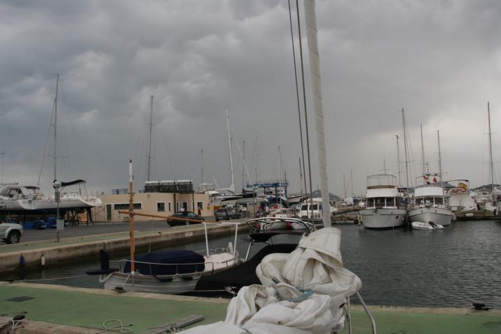 Auch heute wieder das morgendliche Bad. Langsam härten wir uns ab und schaffen es schneller ins Wasser zu kommen. Es waren "schon" 24°C! Anschließend Frühstuck und alles wieder fertig für die Weiterfahrt bereiten. Wie gestern holen wir den Anker hoch und um 09:40h ging es los. Endlich war guter Segelwind und schnell waren Groß und Fock oben. Der Wind kam aus SE. So konnte es bleiben, aber es kommt ja meist anders als man denkt. Die Segel flatterten und dann kam mal wieder eine Böe und so ging dieses "Spielchen" eine Weile. Der Wind frischte immer mehr auf, plötzlich waren es 20 Knoten. Die Wellen wurden höher und hatten Schaumkämme. Was war denn das? Sollten wir wieder Wind und Wellen gegenan haben? Wir schoben schon mit über 30° Lage und plötzlich flatterte die Fock, irgendetwas war gerissen. Schnell den Motor an. Ich blieb am Ruder und Ludwig holte die Fock ein. Anschließend meinten wir, müßen wir uns das wieder antuen, gegenan zu kämpfen und entschieden uns, zurück zu kehren. So hatten wir das Großsegel und ließen uns herrlich wieder zurück schaukeln. Der Motor war natürlich aus. Dieselmal wollten wir in die Marina, denn wir mußten einkaufen und einiges erledigen u.a. der Wäscheberg wuchs und den hätte ich gerne gewaschen. Vor der Marina meldete ich uns an und wir bekamen einen Platz zugewiesen. Der Wind kam recht stramm aus E, aber Ludwig kam gut an den Steg. Uff das war geschafft. Dann sahen wir im Süden wie der Himmel immer dunkler wurde!! Was ist nur mit den Wetter Prognosen los. Es stimmt einfach nichts!! Beim anmelden fragte ich den Marinero ob das normal seiund bekam die Antwort, das nicht! Es sei plötzlich zu kühl geworden und der Levante (Südwind) auch nicht mehr so ganz in der Jahreszeit. War das heute Vormittag ein Winck, daß wir zurückkehren sollten? Auf jedenfall wir trafen die richtige Entscheidung! Nachdem wir gegessen hatten planschten wir erst einmal mit Wasser, der CACIQUE wollte von den Salzkristallen befreit werden. Das macht ja natürlich auch Spaß obwohl es recht kühl war. An der Fock mußten wir noch die Persenning überziehen und schon merkten wir die ersten Regentropfen. Auch das war recht schnell getan und wir sind nach Innen gegangen. Ludwig versuchte wieder ein Wifi Netz zu bekommen, welches mehr oder weniger klappte. Die Wetterfront spielte da wohl auch eine Rolle. Dann hörten wir auch noch den Donner grollen, ach wie gut tat es hier im trockenen und ruhigen zu liegen. Hier werden wir erst einmal das nächste Wetter, den Mistral, abwarten und hoffen eine bessere Prognose zu bekommen. Auf jedenfall es gibt einiges zu tuen, denn ich will die Rostflecken bearbeiten, damit es nicht überhand nimmt.