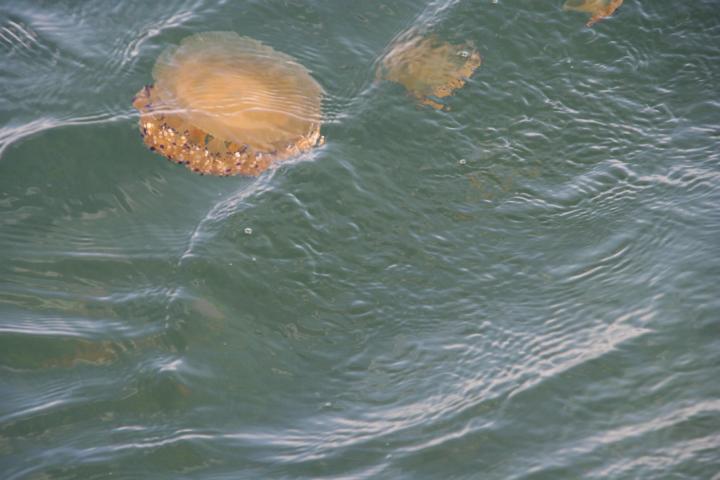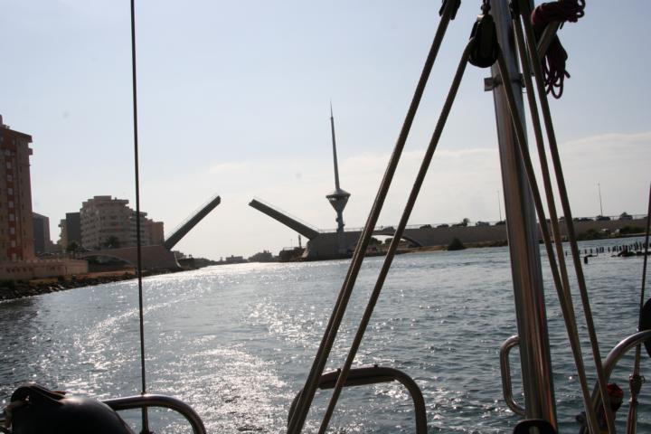 abgekämpft kurz vor 10 Uhr vormittags an. Laut unseren Unterlagen sollte die Brücke um 11Uhr aufgemacht werden. Kaum waren wir in die Einfahrt des Kanals gekommen, sahen wir einen Segler auf dem Weg zur Brücke. Schnell sind wir mit maximaler Motordrehzahl hinterher. Schon sahen wir hinter der Kurve, wie die Brücke hochging und dann aber nichts wie hin und durch. Wir waren im Mar Menor! Am Kanal lagen die vielen Hochhäuser und Hotels. Das Mar Menor ist das größte salzhaltige Binnengewässer Europas. Es enthält einen höheren Salzgehalt als das Mittelmeer. Auch wird gesagt, daß die Schlammablagerungen wertvolle Minerale sowie Anionen Chlorid und Sulfat enthalten und diese eine therapeutische Wirkung haben sollen. Der Kanal war gut ausgebaut. Wir fuhren an der Marina vorbei um ins "Kleine Meer" zu kommen. Was uns ein bisschen stutzig machte, waren die vielen unterschiedlichen Quallenarten im Kanal! Da so herrlicher Segelwind war, holten wir nochmal die Fock raus und segelten im Mar Menor zu einem Ankerplatz im Windschatten hinter einer Insel. Alle Müdigkeit und Strapazen waren vergessen. In der Ankerbucht konnten wir den Anker bei 0,80m Wasser unter dem Kiel setzen. und endlich unseren so ersehnten Kaffee trinken. Wir freuten uns endlich wieder ins Wasser springen zu können. Aber auch hier Quallen, Quallen. Von einem Einheimischen erfuhren wir, daß die Quallen nur leicht "beißen" nicht wie die in der Bucht von Formentera Brandwunden verursachen. Auch waren Leute im Wasser und Kinder planschten stundenlang. So ganz konnten wir uns mit der Situation nicht anfreunden und sind nur kurz ins Wasser um uns zu erfrischen und nicht wie sonst um CACIQUE geschwommen.
